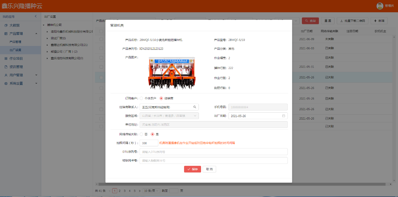 - 產(chǎn)品管理:為播種機(農(nóng)機)生產(chǎn)廠家和其他農(nóng)資(機)經(jīng)銷商提供產(chǎn)品信息(產(chǎn)品描述、技術(shù)參數(shù)、配置及說明)管理;同時可為播種機(農(nóng)機)生產(chǎn)廠家、播種機(農(nóng)機)經(jīng)銷商提供相應(yīng)的銷售區(qū)域管理。